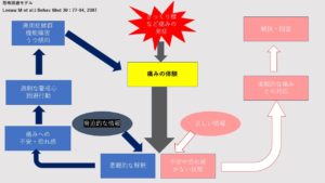 恐怖(例えば、痛み・転倒後の不安・疲労感、等)を感じるとそれを何らかの深刻な障がいのサインなのではと考えて、多かれ、少なかれ、恐怖心を抱きます。その恐怖への対処の仕方により全く違う結果になるというのが【恐怖回避モデル】で表されていることです。