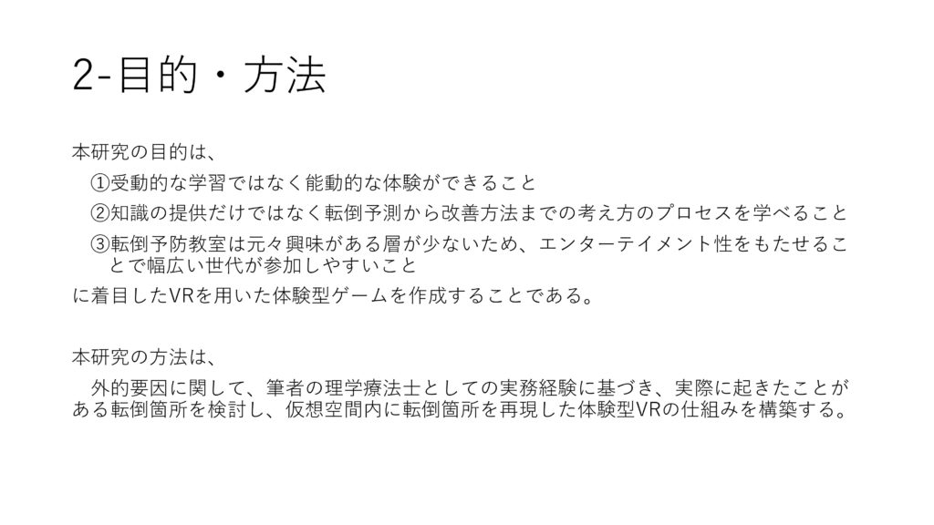 そこで今回は楽しく転倒に関して学べるようVRでゲームを作成しました。